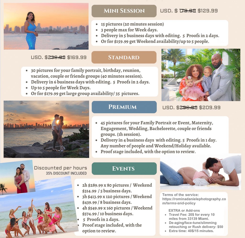 After a photoshoot is processed and delivered and in case we'll have more than the purchased number of pictures on file, clients may have the option to review a preview file of the additional images and choose to purchase some or all of them as extra at the additional cost of $40 per eight pictures.